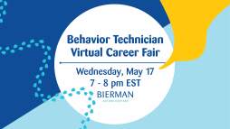 Join us for a casual Virtual Career fair on Wednesday, May 17, from 7-8 pm EST. At Bierman Autism Centers, we're passionate about providing exceptional care for children diagnosed with autism, and we're always on the lookout for exceptional individuals to join our team.