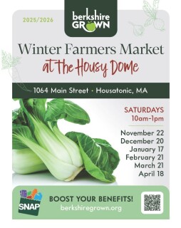 Featuring locally grown and produced foods, including fruits and vegetables, cheeses, meats, breads, and more. Free admission. Indoor market. Live local music. Offering SNAP/HIP benefits with a 1:1 Market Match provided by the Berkshire Agricultural Ventures Market Match Fund and available for up to $30/ shopper at each market. Note our new market hours are from 10AM-1PM. The Housy Dome is included on the Berkshire Regional Transit Authority BRTA route #21. More info at buylocal@berkshiregrown.org.