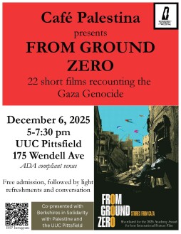 We will be holding our next Cafe Palestina event on Saturday, 12/6/25, from 5:00pm to 7:30 pm. We will be screening a feature length film that has received a great deal of attention and acclaim, From Ground Zero.