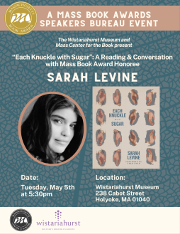 Join the Wistariahurst Museum for an evening with poet Sarah Levine, whose collection Each Knuckle with Sugar received Poetry Honors in the Massachusetts Book Awards. This program will feature a reading from the collection, followed by a conversation with the poet and an audience Q&A. Attendees are invited to engage with the poems and hear Levine speak about her creative process, influences, and the questions that shape her work.