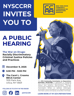 The New York State Community Commission on Reparations Remedies (NYSCCRR) invites you to a public hearing on "The War on Drugs: Racially Discriminatory Criminal Justice Policies and Practices."