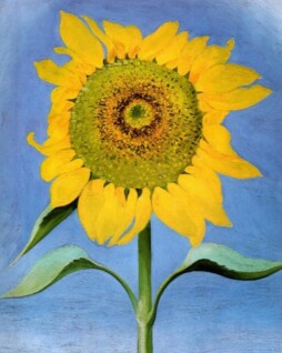 .The Sunflower was a rare subject for O’Keeffe, who painted them only three times. Unlike most of her close-up images of flowers, this painting includes the stem and leaves as well as the bloom, and is framed against a bright blue sky.