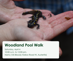 This exploration walk is perfect for nature lovers of all ages! We will learn about woodland pools and the animals who call these places home. These woodland pools, also called vernal pools, are seasonal pools of water that provide habitat for distinctive plants and animals, like spring peepers, wood frogs, and salamanders.
