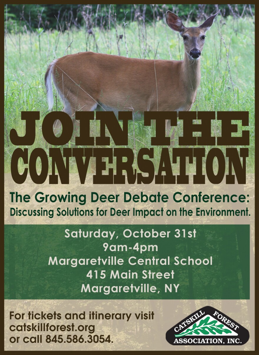 Produced by the Catskill Forest Association, The Growing Deer Debate is a day-long conference being held on Saturday, October 31st in Margaretville, New York. The conference seeks to raise awareness of the deer impact problem on land in the Catskill Mountain Region and throughout the entire eastern United States. A variety of natural resource experts, professionals and authors specializing on the subject will convene to discuss out-of-the-box and cutting edge solutions to reduce impacts. Morning sessions will analyze the multifaceted issue of deer impact on the environment while the afternoon will focus on creating solutions and challenging conventional methods in which deer have been traditionally managed.
